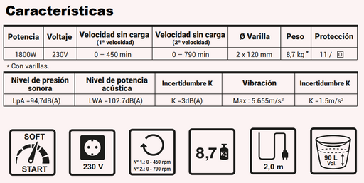 Mezcladora M14 de 1400W M14 Potencia (W) 1400 Voltaje (en V) 220 Tipo de enchufe F (EURO) Velocidad mínima / máxima (en rpm) 0-5...